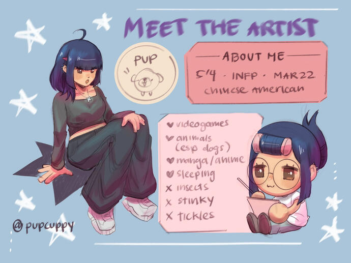 hello! i go by @pupcuppy on most socials. i am an chinese-american illustrator who likes drawing cute things!follow my socials to keep up with my artistic ventures :)